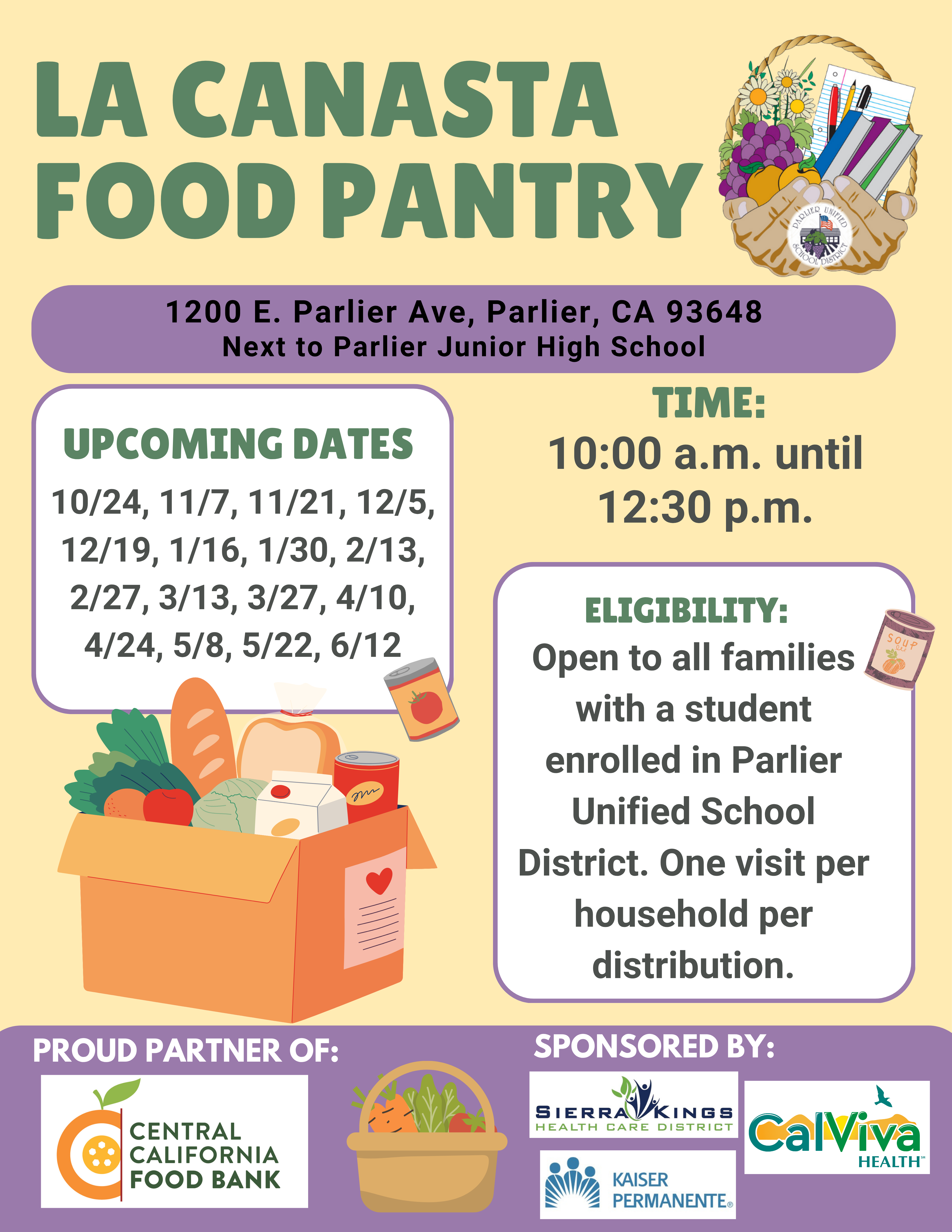 Parlier Unified School District is proud to offer La Canasta Food Pantry, providing biweekly food distributions to support our Parlier Unified families.