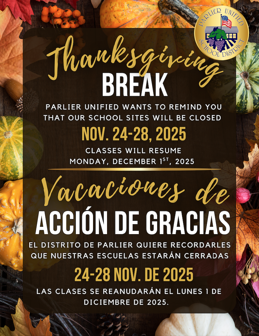 Parlier Unified School District would like to remind our community that all school sites will be closed from November 24–28, 2025. Classes will resume on Monday, December 1, 2025.